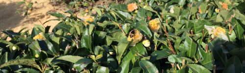 お茶刈りも一段落つく秋、お茶畑はお花畑になります。 お茶の木は椿の仲間、椿のような花が咲き、 ハチやハナアブが舞う秋の昆虫の楽園となります。 オーガニック農法のため、毎度来る虫も健康のようです。